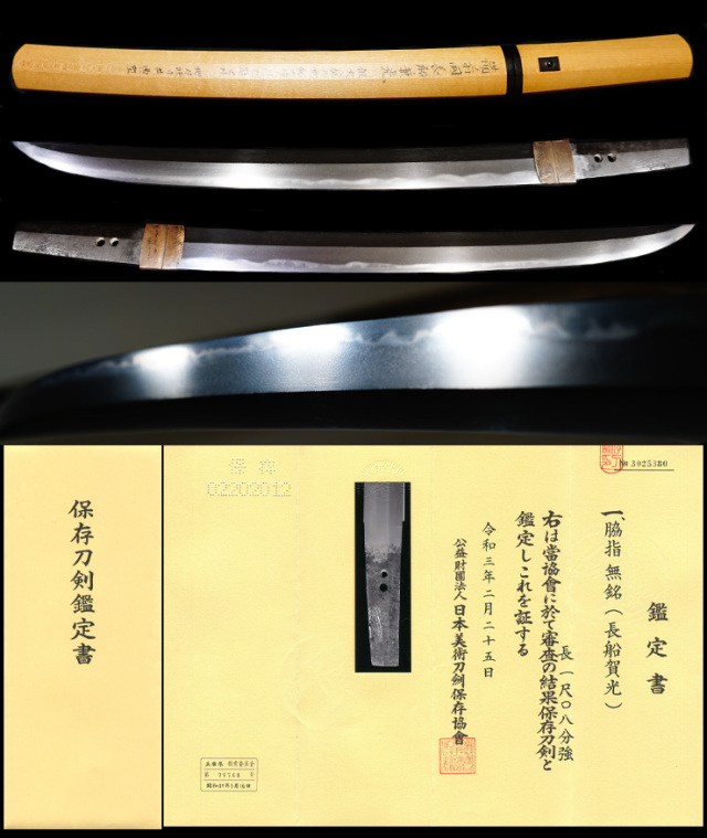 銘文 『無銘』 種別 わきざし 長さ 32.9センチ 反り 0.5センチ 元幅27ミリ 元重5ミリ 刀身227グラム (すべて約です) 兵庫県教育委員会