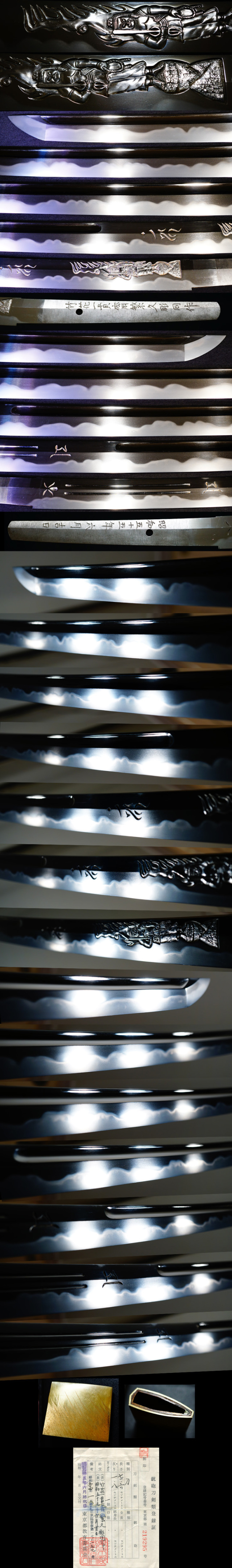 銘文 『竹花一貫斎繁久彫同作』『昭和五十五年六月吉日』 種別 刀 長さ 71.6センチ 反り 1.8センチ 元幅 33ミリ 元重 8ミリ 先幅 23ミリ 先重 6ミリ 刀身重量 859グラム (すべて約です) 東京都教育委員会