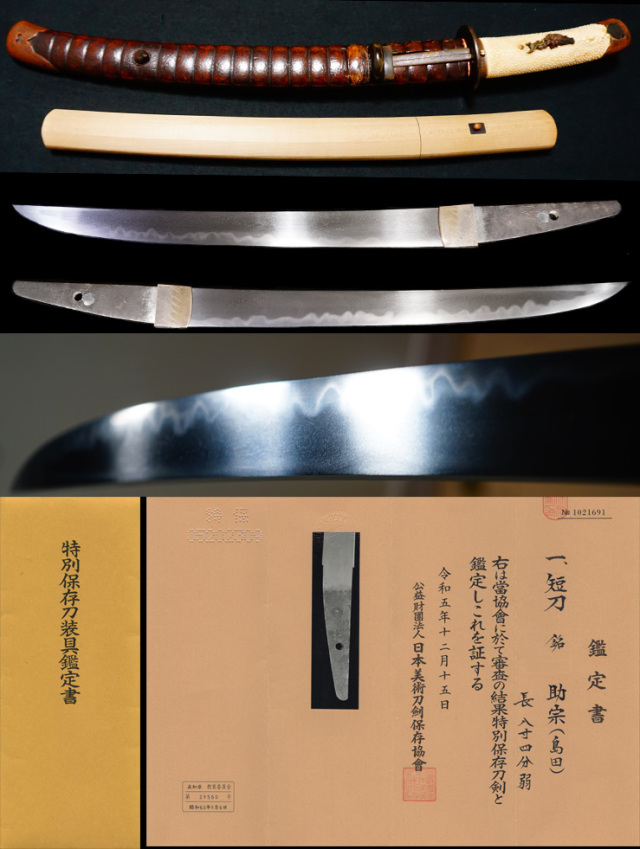 銘文『助宗』 種別 短刀 長さ 25.4センチ 反り 0.4センチ 元幅24ミリ 元重5.5ミリ 刀身重量130グラム (すべて約です) 高知県教育委員会